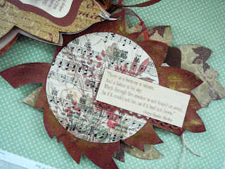 Mary makes wonderfully detailed mini scrapbooks and the Autumn Joy one is the one she sent. The pages are leaf shaped chipboard covered with scrapbook papers and embellished beautifully.